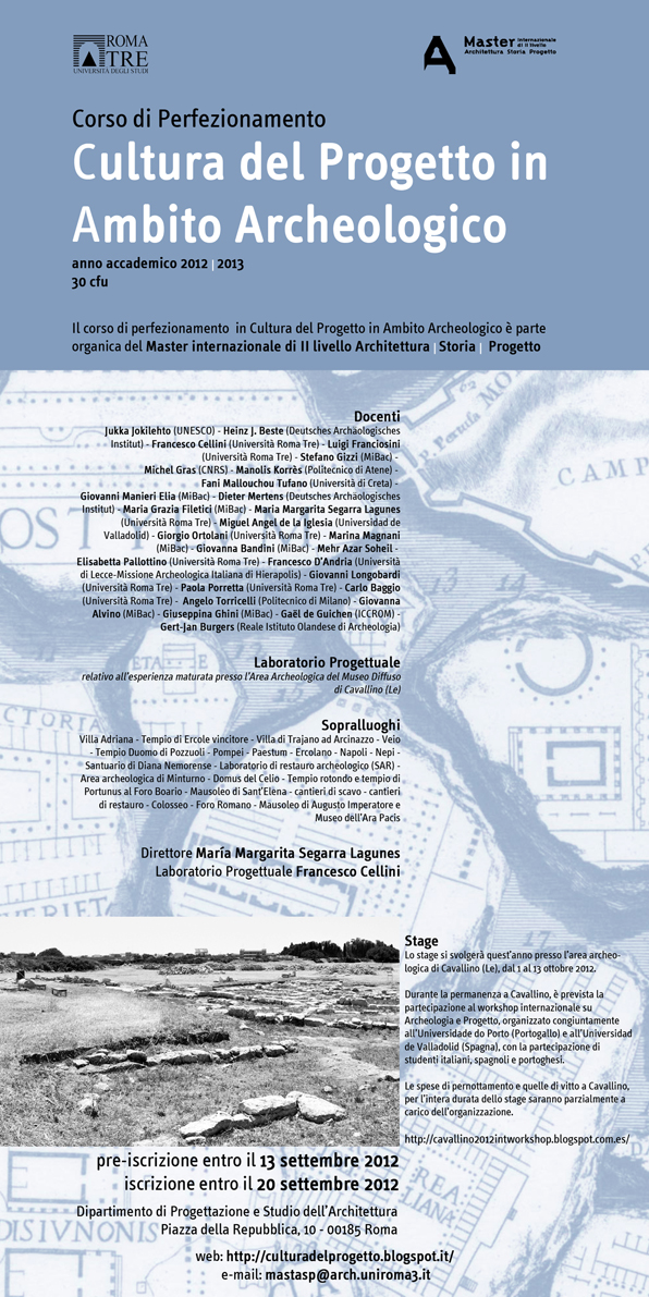 Il Corso di Perfezionamento in Cultura del progetto in ambito archeologico partecipa organicamente al più ampio programma didattico del Master Internazionale di II livello Architettura | Storia | Progetto, costituendosi come uno dei moduli didattici di esso.